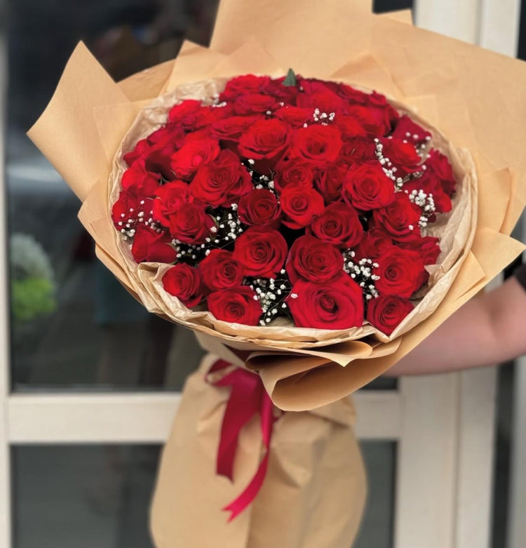Buqetë me Trendafila të Kuq - një zgjedhje klasike dhe elegante që shpreh ndjenja të thella. Çdo trëndafile është zgjedhur me kujdes për cilësinë dhe bukurinë e saj, duke siguruar një pamje të mahnitshme që zgjat. Ideale për aniversare, deklarata të dashurisë ose momente të veçanta që kërkojnë elegancë. Lulët e freskëta ruhen në kushte optimale për të garantuar qëndrueshmërinë maksimale. Kjo buqetë kombinon tradicionin me sofistikimin, duke e bërë atë dhuratën e përsosur për të dashurit tuaj.