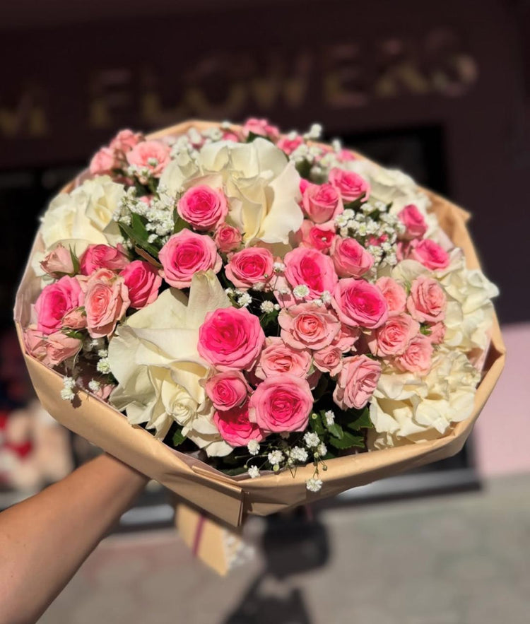 Buqetë me Trëndafila - Elegancë dhe Pasion në Çdo Petale Zbuloni bukurinë e pamatë të kësaj buqete eksklusive, i përbërë nga trëndafila të zgjedhur me kujdes dhe të rregulluar me artizanat te lartë. Çdo lule është një simbol i dashurisë dhe admirimit, e përsosur për momente të veçanta ose për të shprehur ndjenjat tuaja më të thella. Trëndafilet tona garantojnë freskësi maksimale dhe zgjatje të gjatë të jetës në vazo. Ideale për martesa, ditëlindjet, përvjetore ose thjesht për të bërë dikë të ndihet special. Ky buqetë kombinon elegancën klasike me një prekje moderne, duke e bërë atë dhuratën perfekte për çdo rast.